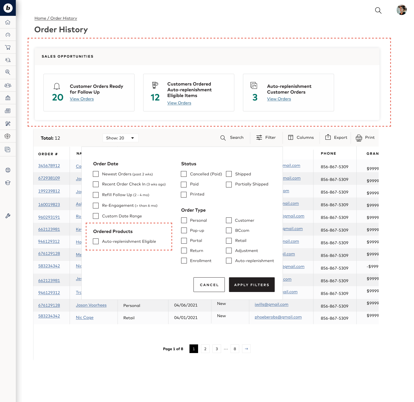 Preset filters were created to show consultants which customers would be ideal to contact soon, and who were already ordering subscription-eligible items.New Order Detail CTAs: